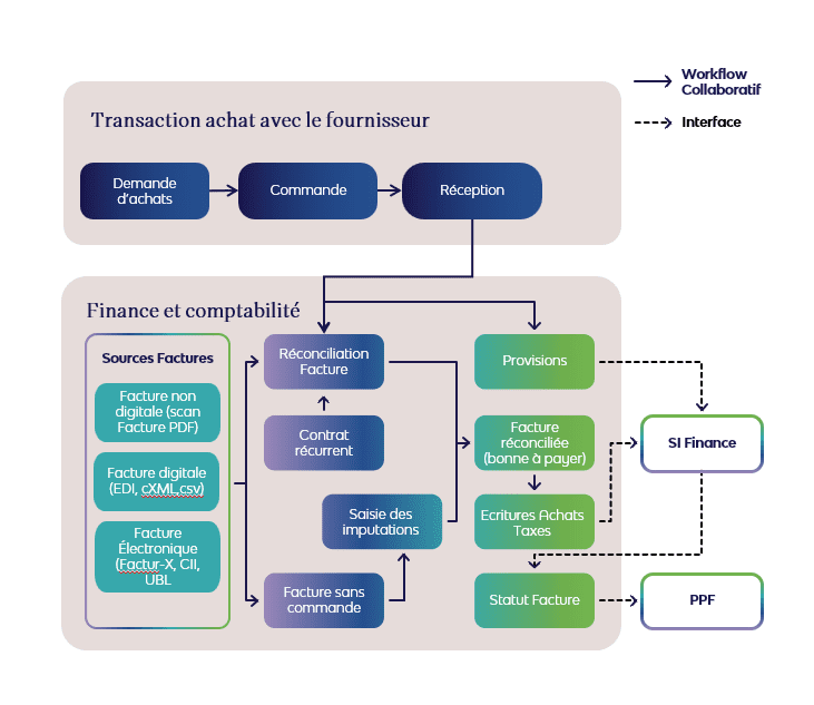 | Traitement des factures fournisseurs | Rapprochement commande–réception–facture (3-way match) et comptabilisation. |